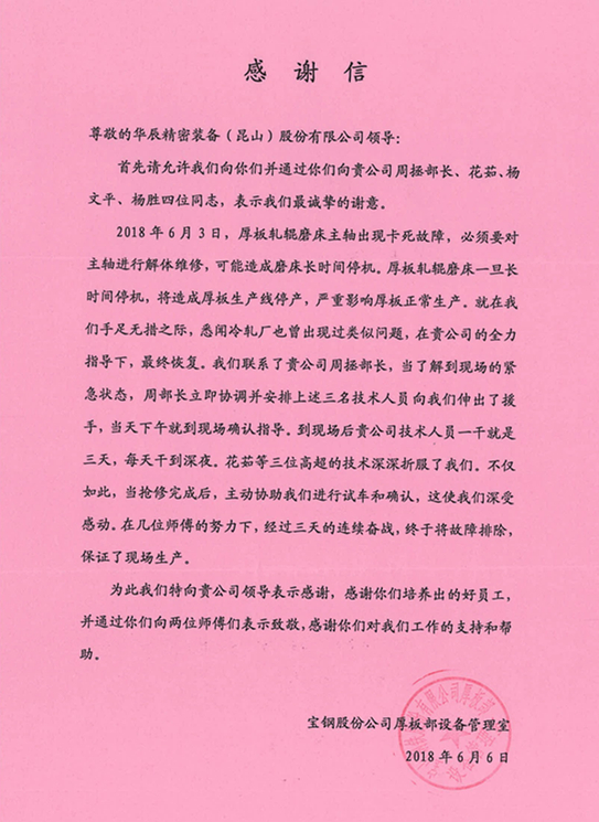 近日,寶山鋼鐵股份有限公司(以下簡稱寶鋼)厚板部向我司發(fā)來感謝信,對(duì)我司領(lǐng)導(dǎo)的及時(shí)協(xié)調(diào)、技術(shù)人員高超的專業(yè)水平、客戶至上的服務(wù)理念表示了誠摯謝意。